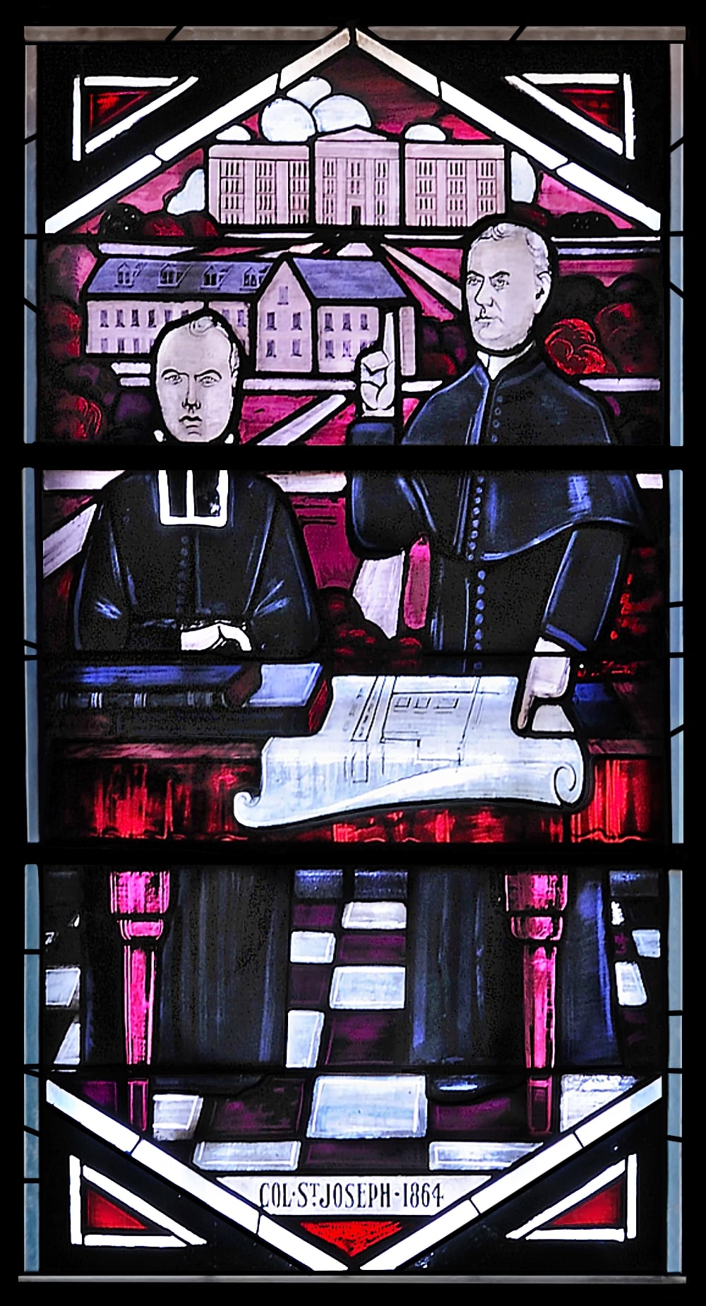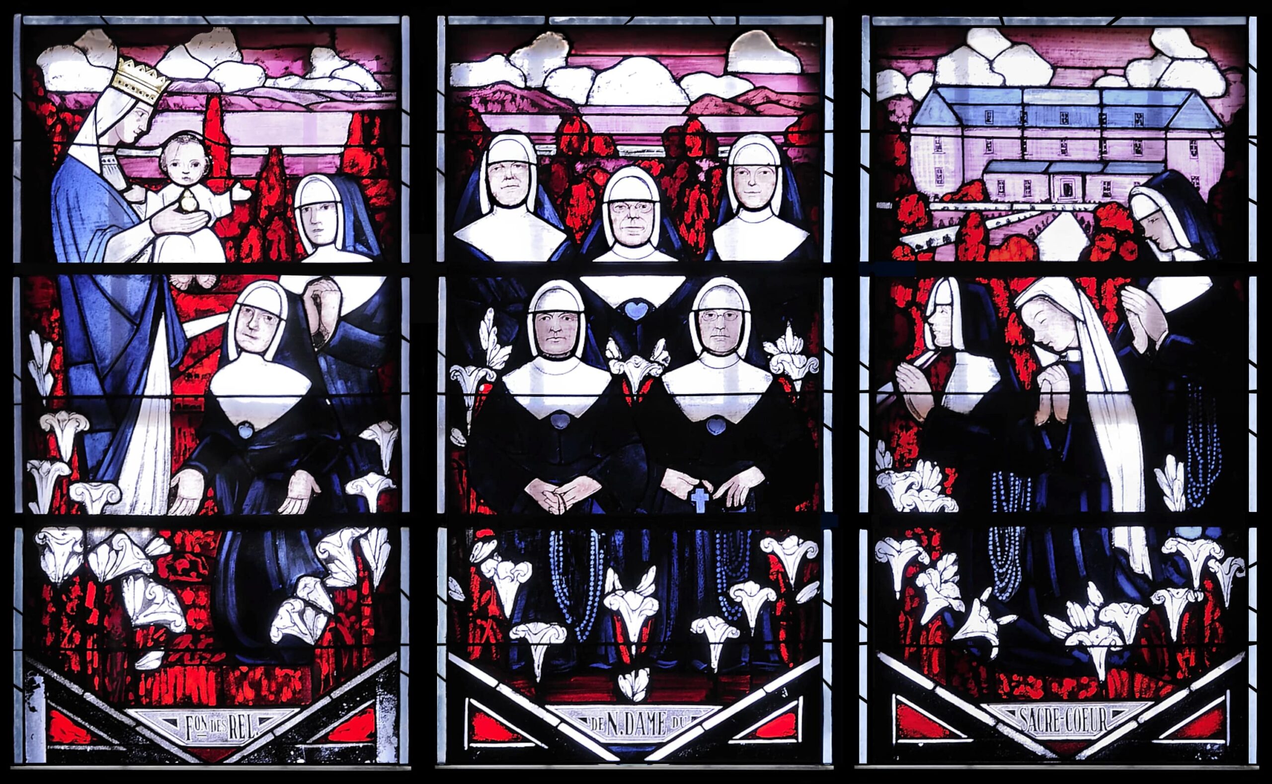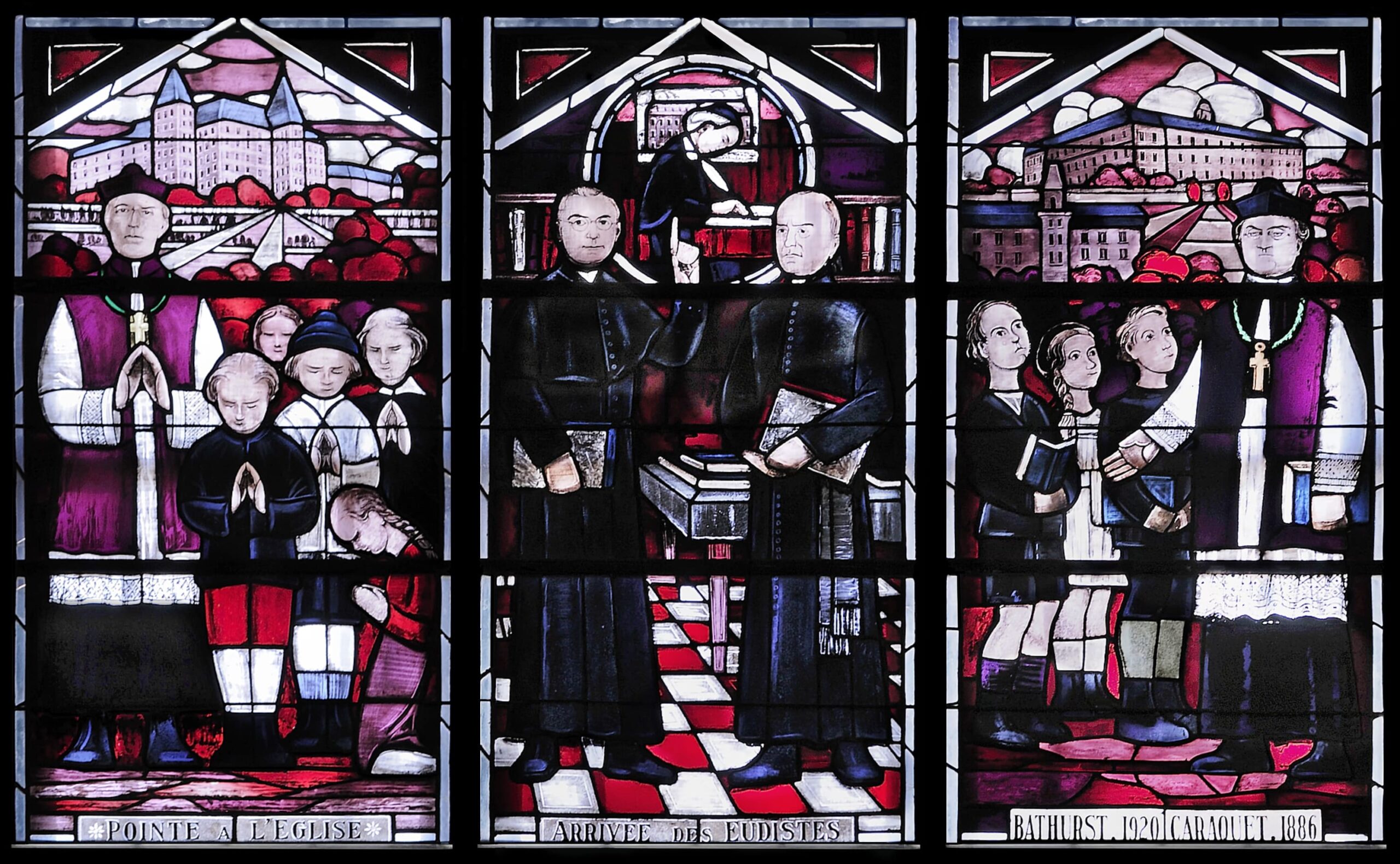 C’est la collaboration de l’artiste verrier français Auguste Labouret, de l’architecte Louis Napoléon Audet, de deux sœurs de la congrégation Notre-Dame-du-Sacré-Cœur et enfin de l’archevêque Mgr L.-J.-Arthur Melanson, sur son lit de mort, qui a rendu possible la réalisation de ces verrières dites « historiées ». Pionniers et fondateurs, femmes comme hommes, figurent sur ces œuvres dressées à l’effigie de l’Acadie, dont les peintures initiales ont été dessinées par les sœurs Marie-Léonide (Gertrude Godbout) et Marie-Agnès (Edna Duguay).
