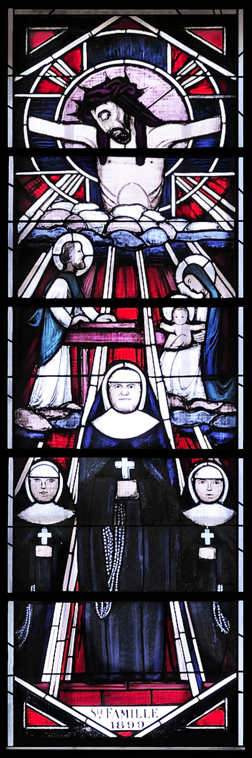D’un point de vue technique, ce travail s’inscrit dans la tradition du vitrail : celle de la (relativement) mince vitre, teintée et entourée de plomb, avec une exécution de Labouret selon les dessins originaux des sœurs. Chacune de ces deux verrières est composée de 10 scènes, toutes ayant leurs particularités, toutes illustrant un certain moment dans l’histoire de l’Acadie. Les verrières comptent un total de 18 panneaux chacune ; ceux-ci sont organisés selon 6 rangées de 3 panneaux, les panneaux des rangées de 2 à 5 étant regroupés en ce que l’on appelle des triptyques – trois éléments individuels, dans ce cas trois panneaux qui, mis ensemble, forment une scène.